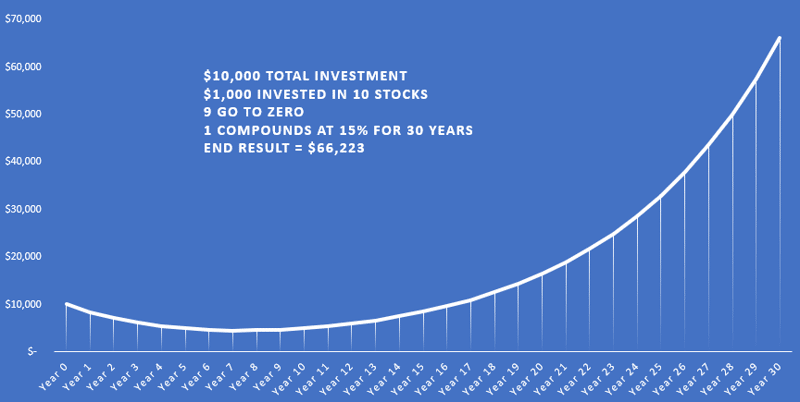Just like baseball, a single hit in investing can undo a lot of mistakes. The below chart shows the growth of $10,000 over 30 years. In the example, $1,000 is invested in 10 individual stocks. 9 out of 10 go to $0, but 1 compounds at 15% for 30 years.